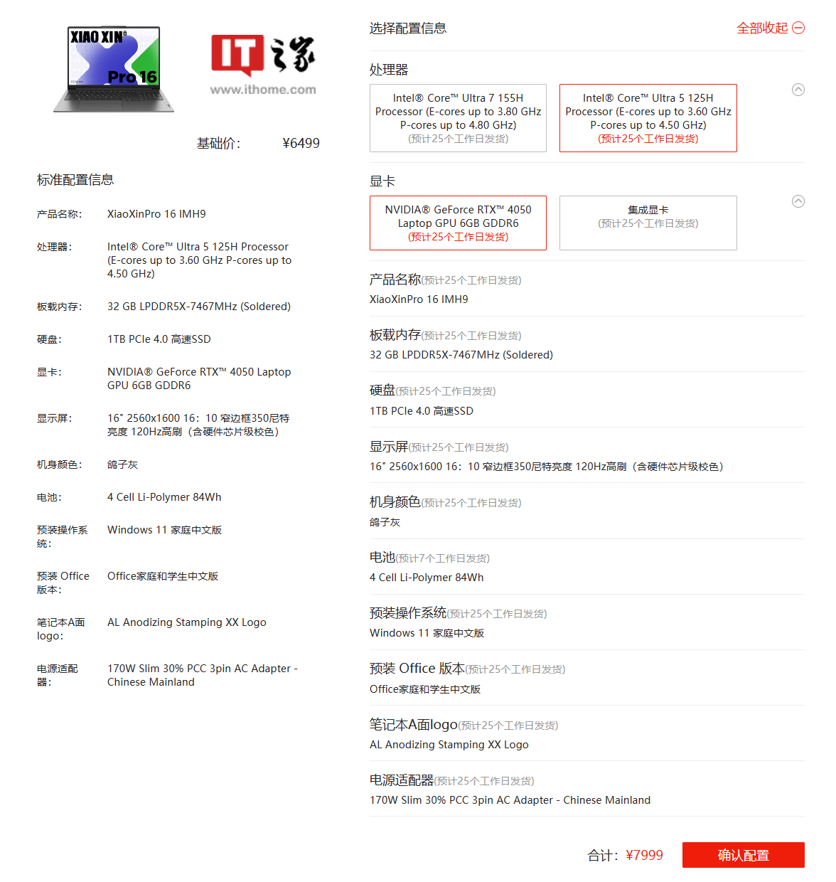 小新 Pro 16 2024 独显版现已于联想官网开启定制,预计 25 个工作日发货,IT之家附联想官网定制页面如下: