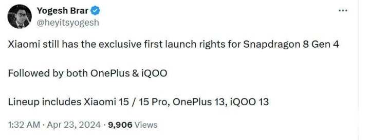 据爆料者透露,小米已经拿下了骁龙8 Gen4的独家首发权,小米15系列将会是该芯片的首发机型。爆料者还补充到,继小米之后,OnePlus和iQOO将紧随其后。