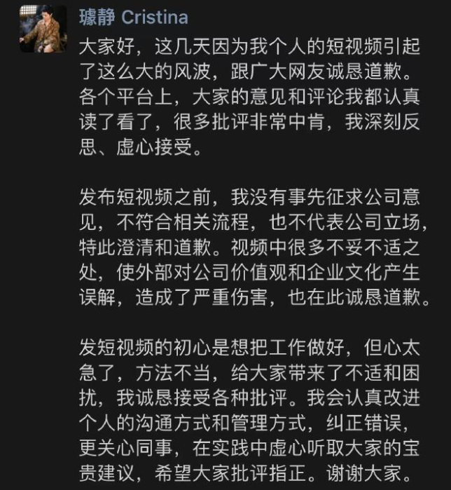 发布短视频之前,我没有事先征求公司意见,不符合相关流程,也不代表公司立场,特此澄清和道歉。视频中很多不妥不适之处,使外部对公司价值观和企业文化产生误解,造成了严重伤害,也在此诚恳道歉。