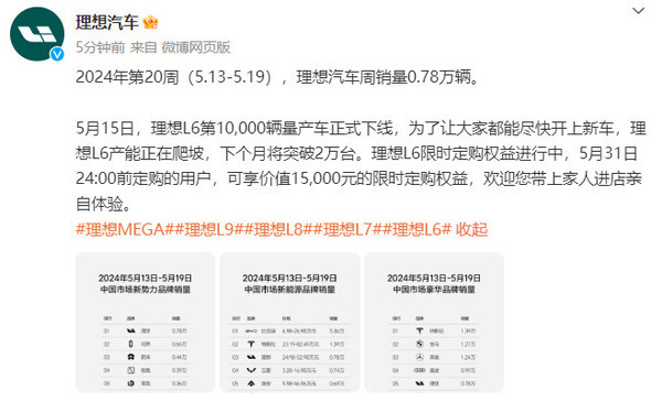 理想汽车公布最新周销量:0.78万辆超越问界排名第一