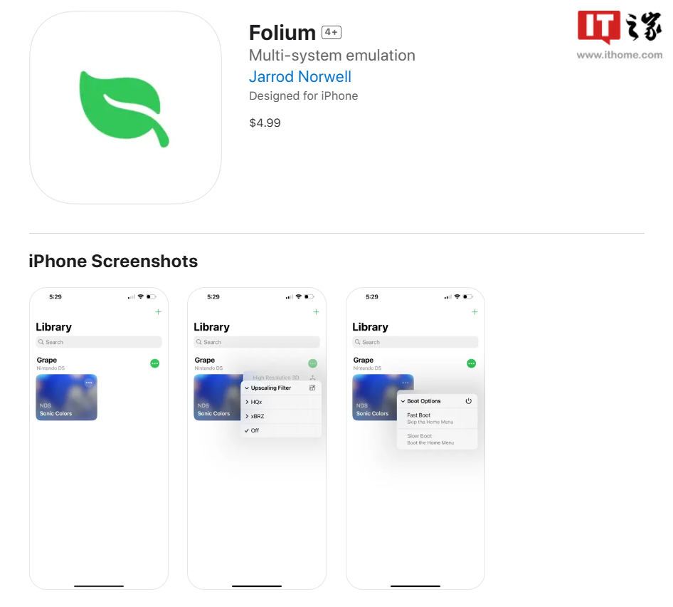 IT之家 6 月 2 日消息,据IT之家网友投稿反馈,支持 GBA / NDS / 3DS 等平台的模拟器 Folium 正式上架 AppStore,大小 49.9MB。不过,这款应用暂未在国区上架,海外的售价为 4.99 美元。