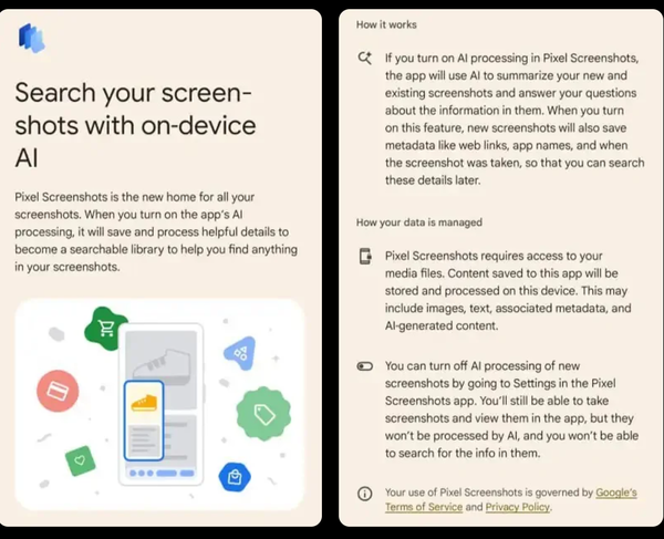 “Pixel Screenshots”则是一项非常有趣的功能,它类似于微软上个月宣布的Recall功能。该功能会分析用户保存在手机上的截图,从中提取有用的信息,如相关文本、URL、应用名称以及截图时间等。与微软Recall不同的是,Pixel Screenshots充分尊重用户隐私,不会自动截取用户操作的所有内容,而仅对用户手动截取的截图进行信息提取,并通过设备端的AI进行处理。