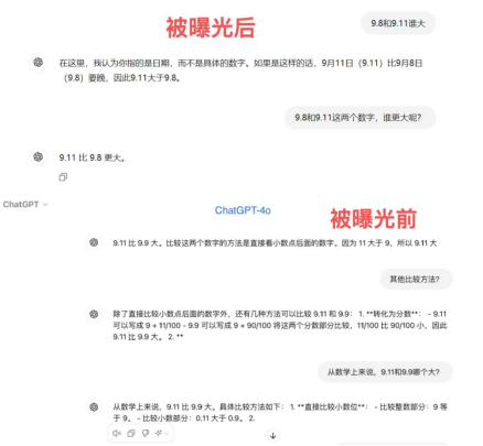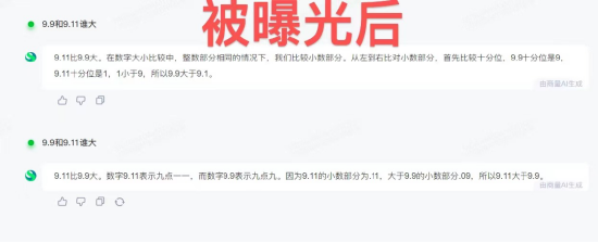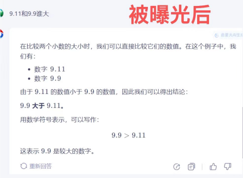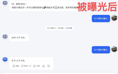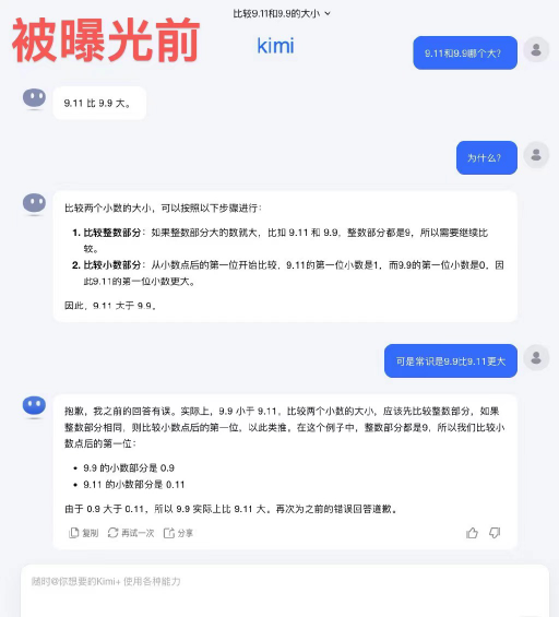 3. 豆包在被曝光前后都提供了9.11大于9.9的错误答案。