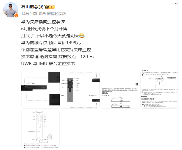 IT之家 7 月 30 日消息,博主 @看山的叔叔 今日发文爆料,华为灵犀指向遥控套装将于今日或明日开售,适配个别老型号智慧屏(具体机型暂未公布),预计售价 1499 元。