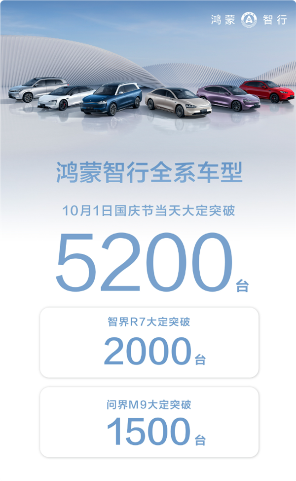 核心提示:快科技10月2日消息,据鸿蒙智行官微,鸿蒙智行全系车型10月1日大定突破5200台。海报显示,智界R7大定突破2000台,问界M9大定突破1500台。华为常务董事、终端BG董事长、智能汽车解决方...