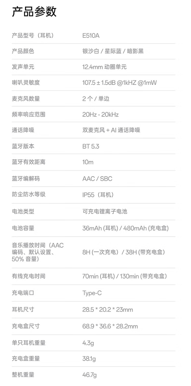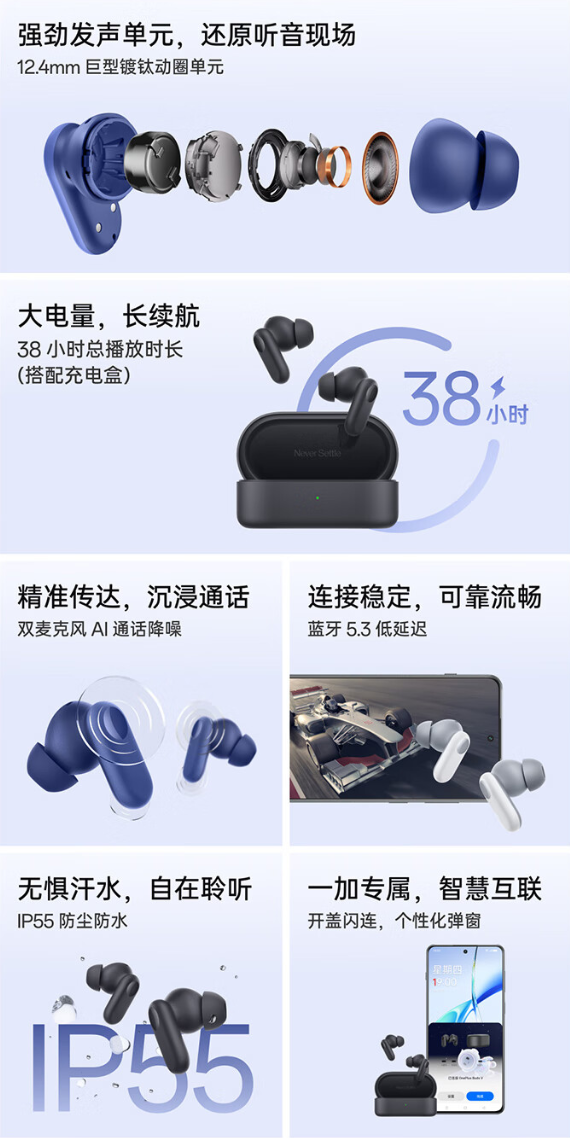 其他方面,其支持 IP55 级防尘防水,最长可提供 38 小时续航(搭配充电盒),最长连续播放时间为 8 小时。