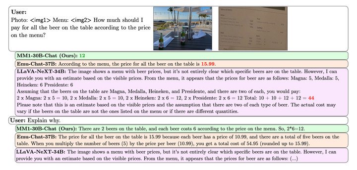 相关论文举例说明了 MM1 在识图、推理方面的能力:MM1 看到一张阳光斑驳的餐厅桌子,上面有着几个啤酒瓶和菜单的图片,被问及「人们要为桌上的啤酒支付多少费用」时,MM1 读出了菜单的价格并计算了啤酒的价格。